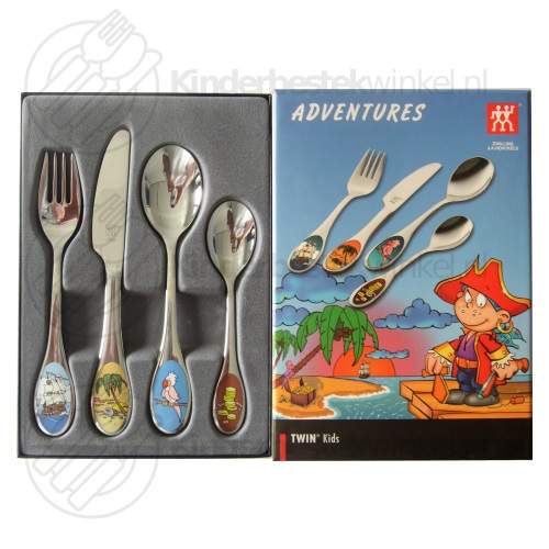 Dit Zwilling kinderbestek met Adventures thema bestaat uit een vork, mes, lepel en dessertlepel. Het is geschikt voor kinderen van circa 3 tot 6 jaar en ouder. Op de bestekdelen van het kindercouvert staan vier verschillende gekleurde afbeeldingen van een piratenschip, strand met palmboom en schatkist, papegaai en gouden munten. Op het deksel van de geschenkverpakking van deze kinderbestekset staat het kinderbestek afgebeeld.
