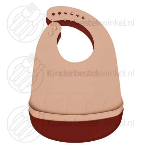 Set of two silicone We Might Be Tiny bibs in colours beige and rust.