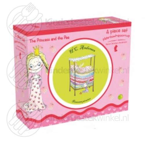 Princess and the Pea children's tableware melamine 4-pieces (H.C. Andersen) by Barbo Toys in carton gift packaging. Contents: child's plate, bowl, mug and spoon.