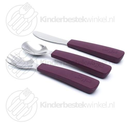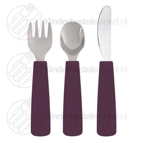 Driedelig siliconen met rvs We Might Be Tiny peuterbestek met vork, mes en lepel in de kleur paars (pruim).