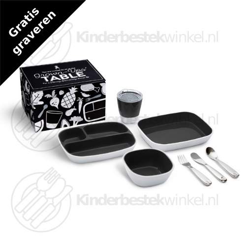 Grown-Ups Table kinderset zwart 7-delig van Munchkin in kartonnen geschenkverpakking. Gratis graveren van vork, mes en lepel aan voorzijde is mogelijk.