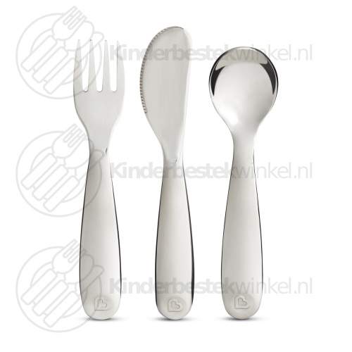 Polish kinderbestek rvs 3-delig van Munchkin in kartonnen geschenkdoosje. Gratis graveren van vork, ..