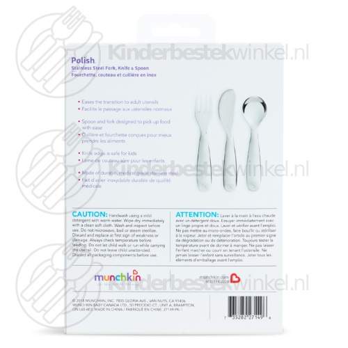 Polish kinderbestek rvs 3-delig van Munchkin in kartonnen geschenkdoosje. Gratis graveren van vork, mes en lepel aan voorzijde is mogelijk.