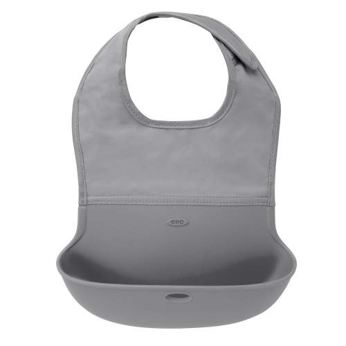 Slabbetje oprolbaar grijs van OXO Tot van zacht stof en duurzaam siliconenrubber met klittenbandsluiting.